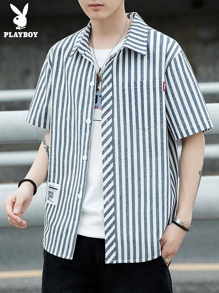 花花公子条纹衬衫男短袖设计感小众港风日系痞帅休闲纯棉男士衬衣热门设计联盟服务商